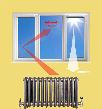 Below Red in the spectrum is Infrared (Radiant Heat), this is slightly less energetic than visible light. The longer wave length heating region is reflected by glass.